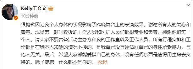 很抱歉因为我个人身体的状况影响了昨晚舞台上的表演效果,谢谢所有人的关心和善意。现场第一时间救援的工作人员和医护人员都很专业和负责,感谢他们每一个人。请大家不要责备活动主办方和我的工作室以及工作人员,所有行程安排和工作都是在我本人知晓的情况下接的,是我自己没有评估好自己的身体承受能力,与他人无关。最后,希望大家都能爱惜自己的身体,没有任何东西是值得用生命去交换的。除了健康,什么都不是你的。