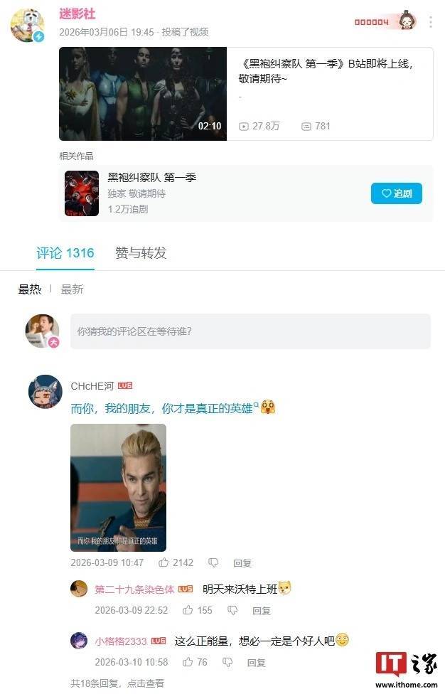 IT之家 3 月 12 日消息,哔哩哔哩电视剧官方账号 @迷影社 宣布网上配资_配资炒股,反超英剧《黑袍纠察队 第一季》即将上线B站(首播时间暂未公布)。