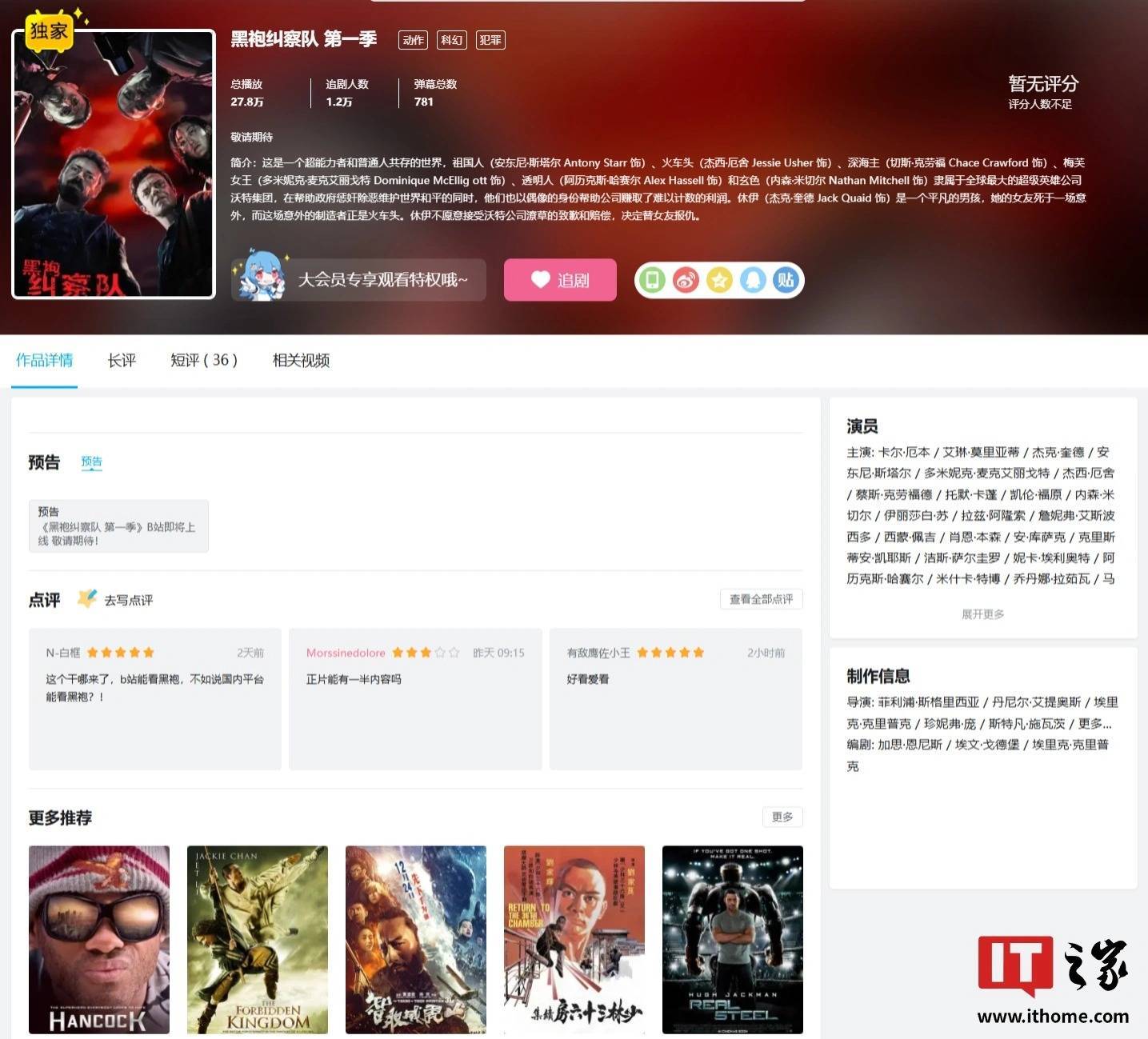 IT之家从B站官网获悉,《黑袍纠察队 第一季》将讲述纠察队的启源、铺垫整体故事的走向,以及祖国人的成名史等,目前预告的播放量已突破 27.8 万,1.2 万人选择追剧。本剧简介如下: