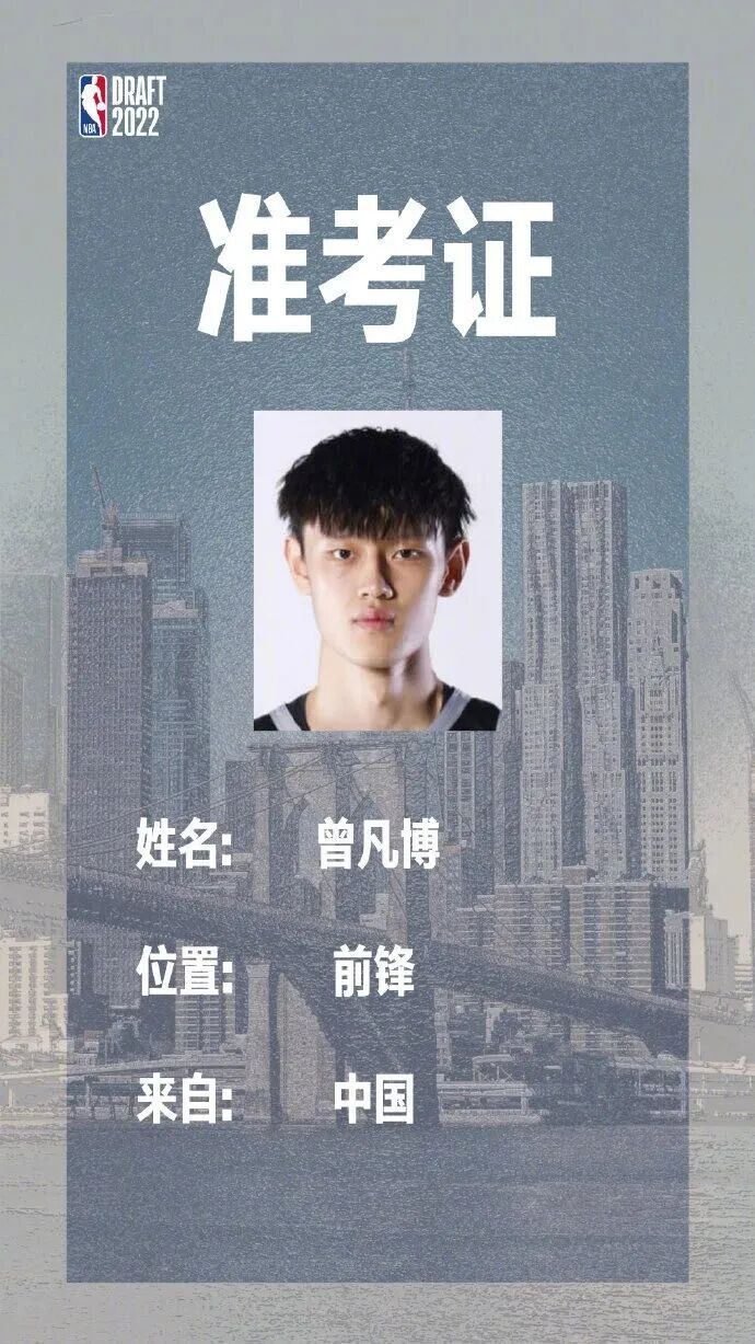 2022年,当时19岁的曾凡博报名参加了NBA选秀,可惜最终遗憾落选。